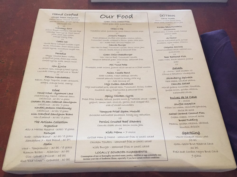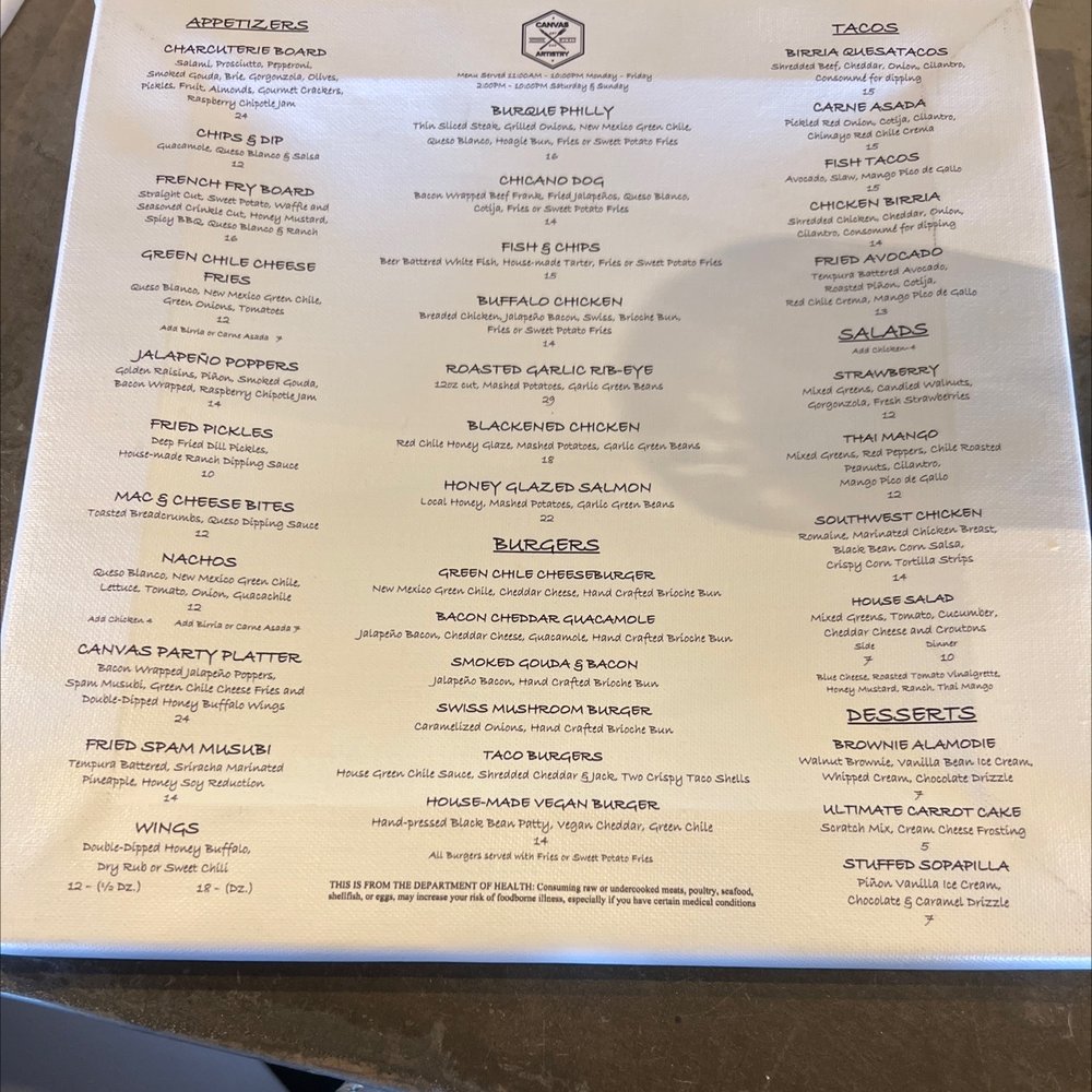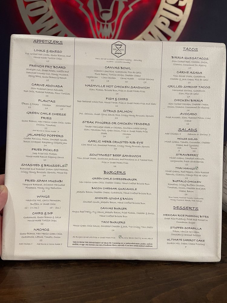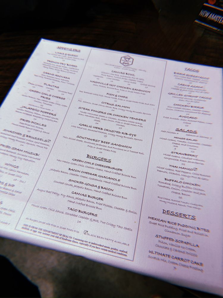 Canvas Artistry is a vibrant hotspot in Albuquerque, offering a unique fusion of live music, tacos, and American cuisine. Located on a rooftop with ample space for dining and dancing, the venue exudes dive bar and club vibes, making it perfect for a night out. The menu features a variety of dishes, with standout items like the flavorful burgers and creative drinks receiving high praise. While the service may be a bit slow during busy times, the friendly staff and lively atmosphere make up for it. With stunning artwork, great music, and delicious food, Canvas Artistry provides a great dining experience in the heart of downtown ABQ. Whether you're looking for a fun night out or a casual dinner, this hip and trendy spot is definitely worth checking out.